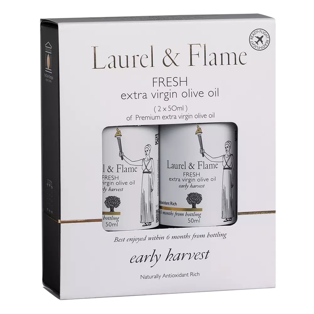 Laurel & Flame Fresh is an early harvest single variety extra virgin olive oil from the emblematic indigenous variety Tsabidolia (tsabi means bunch in Greek), the fruiting of which grows in bunches, hence its name. The fruit comes from centuries-old olive trees over 150 years old, which grow on low hills in the plain of Ancient Olympia. Harvest takes place during the months of September and October, giving high nutritional value to the product as well as unripe and aromas of fruits and herbs. The olive extraction takes place within 4-5 hours of harvest, followed by a light filtering and bottling with the use of nitrogen. The high concentration of polyphenols recommends its consumption within 6 months of after bottling.