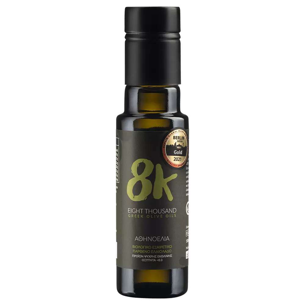 Το 8K Athinolia Premium Organic EVOO είναι ένα βραβευμένο μονοποικιλιακό βιολογικό εξαιρετικό παρθένο ελαιόλαδο από την ποικιλία Αθηνολιά. Οι ιδιαίτερες κλιματολογικές και εδαφολογικές συνθήκες που επικρατούν στη συγκεκριμένη περιοχή είναι γνωστές για την παραγωγή ελαιολάδου υψηλής ποιότητας και διατροφικής αξίας.