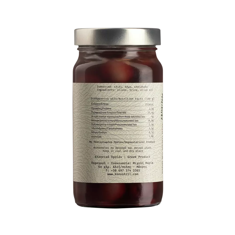 Οι Φυσικές Μαύρες Ελιές Μάκρης σε Άλμη της οικογενειακής επιχείρησης Konos είναι ένα προϊόν όψιμης ωρίμανσης της ποικιλίας Μάκρης. Μετά την πρώτη διαλογή, ο καρπός ζυμώνεται αποκλειστικά σε άλμη ακολουθώντας τη φυσική διαδικασία εκπίκρανσης.